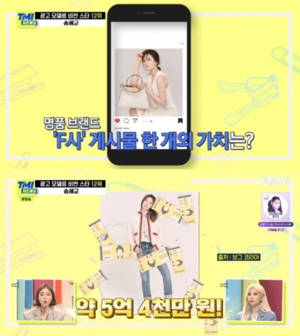 宋慧乔的代言效应惊人,根据《TMI NEWS》整理,她2013年在《看见你的爱》用过的兰芝气垫粉饼,年销100万颗;2016年《太阳的后裔》擦的兰芝唇膏1个月热卖16万支,还卖到缺货;2018年《男朋友》使用的雪花秀唇膏,也引起粉丝疯抢,带旺品牌销售额暴增6倍。她隔年起每支广告价码高达9亿韩元,今年接了4支代言,总共进帐36亿韩元,仅排在第12名。