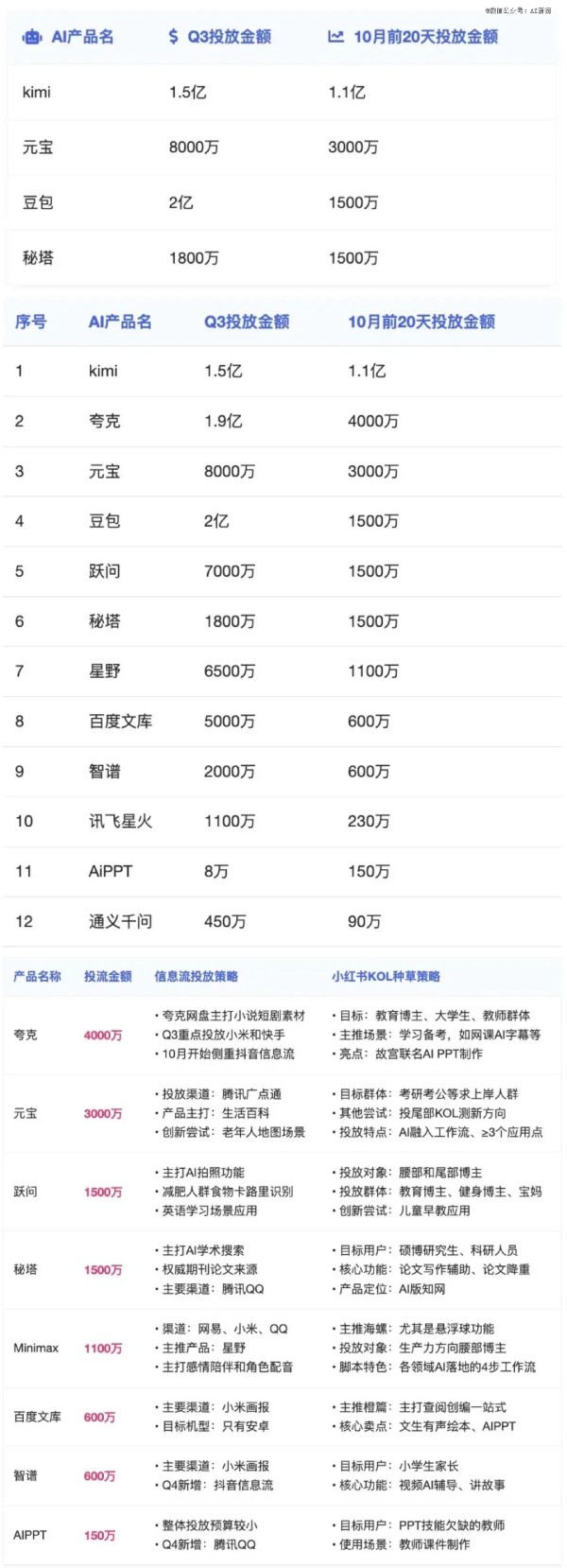 根据图上信息,Q3豆包花在广告投放上的金额高达2亿,夸克1.9亿紧随其后,而成立不到2年但一向以投放大胆著称的明星AI公司Kimi,20天投了1个多亿。