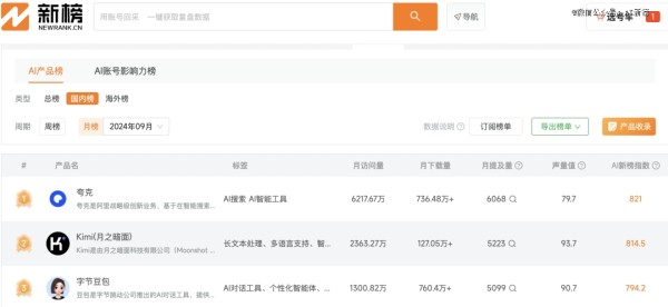 这也为Kimi带来了最直接的数据反馈。据“AI新榜”发布的AI产品榜,9月,Kimi月下载量超127万次,位列总榜第5,国内榜第2。