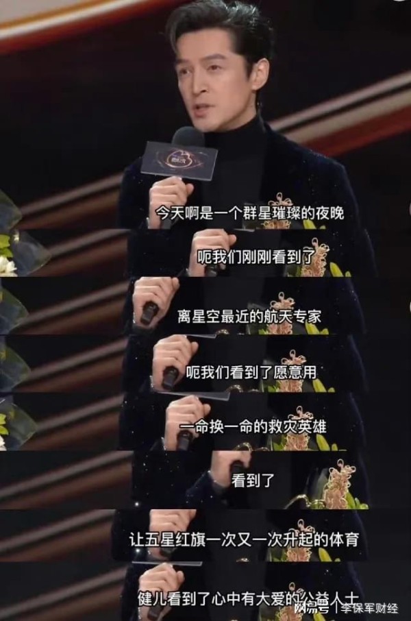 “今天是一个群星璀璨的夜晚,我们刚刚看到了离星空最近的航天专家;看到了愿意用一命换一命的救灾英雄;看到了让五星红旗一次又一次升起的体育健儿;看到了心中有大爱的公益人士。”