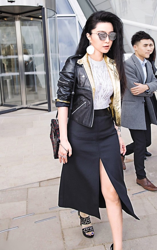 压轴亮相的范冰冰,气场真的不是一般的大。已经是时装周常客的范冰冰对于造型信手拈来,黑超遮面,LV不规则层叠吊坠耳饰配对,身着短款黑色包金边皮夹克内搭白色半透视针织衫,黑色高腰裙配对粗跟鞋,手上的戒指和腕间钻石表都来自萧邦。范冰冰这样说自己的造型:“为了迎合造型,专门设计这样一个发型,昨天晚上睡觉前在头上编了将近20多个辫子,整整一夜,都几乎没怎么睡,今天早上起来辫子松开就成了这样的效果。像杀马特。哈哈。”