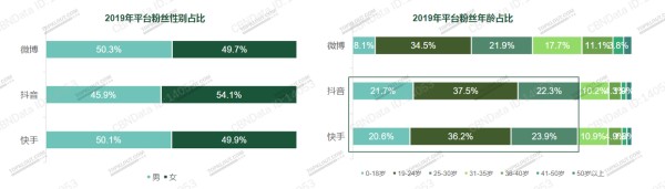 从抖音、快手、微博平台的粉丝性别看,微博、快手用户男女比例较为均衡,而抖音的用户中女性用户占比略高。从年龄结构来看,微博的覆盖年龄段更广;抖音和快手用户相对更年轻,30岁以下用户占比均在80%以上。从年龄分布情况看,大量粉丝都集中于19-24岁之间。