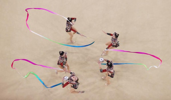 8月10日,中国队在巴黎奥运会艺术体操集体全能决赛中。新华社记者 郭昱 摄