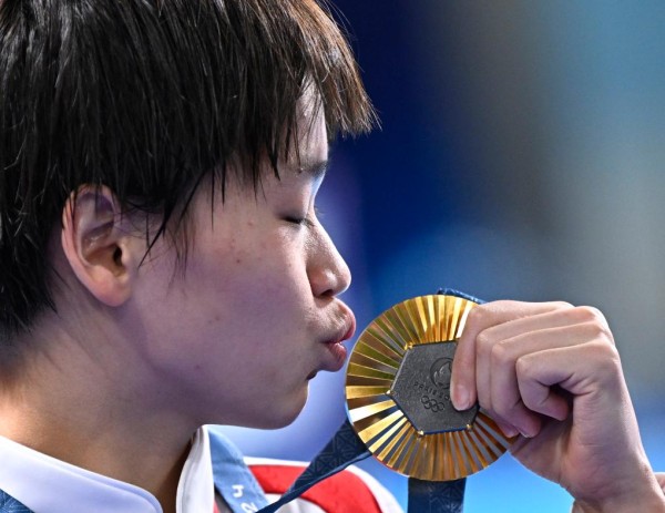 8月6日,全红婵在巴黎奥运会跳水女子10米台颁奖仪式上亲吻金牌。新华社记者 王鹏 摄