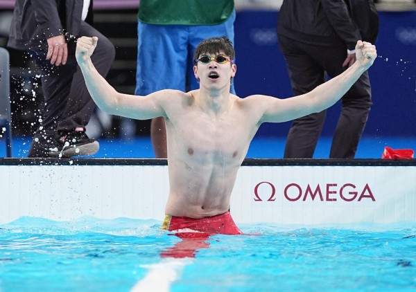 7月31日,潘展乐在巴黎奥运会游泳男子100米自由泳决赛后庆祝。新华社记者 杜宇 摄