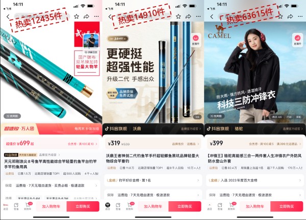 本次 DOU 来钓鱼户外运动嘉年华,从垂钓场景拓展至户外全类目,多个品类实现增长。户外场景商家报名近 400 家,户外服装日均支付 GMV 环比爆发 78%,运动夹克日均支付 GMV 环比爆发 346%,冲锋衣裤日均支付 GMV 环比爆发 281%。