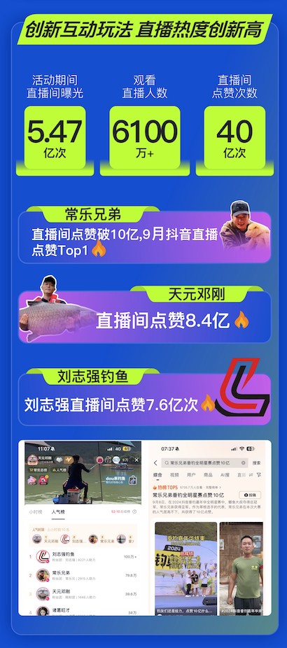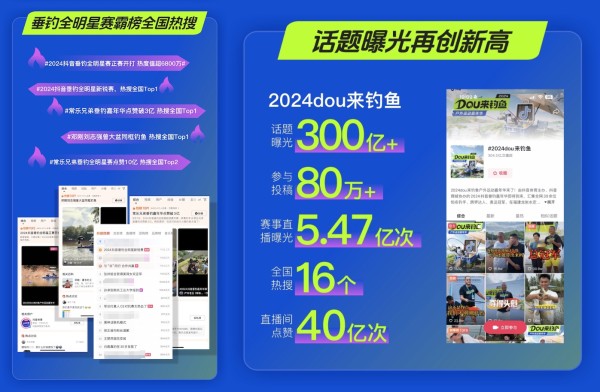 活动期间,#2024DOU 来钓鱼话题总曝光量破 300 亿,观看直播人数超 6100 万,垂钓装备百万爆品达到 14 个。