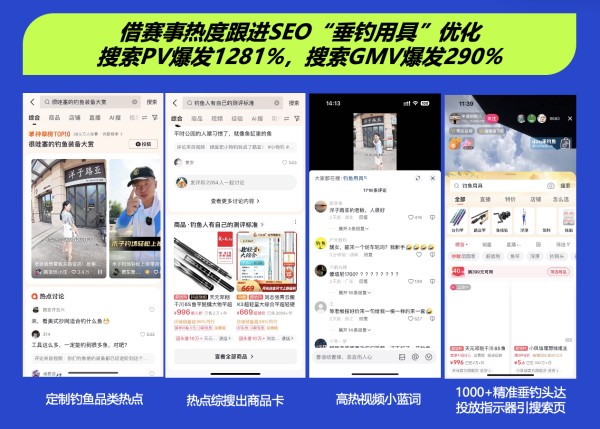 活动期间,通过商达合作增强商品曝光,同时借助达人视频底部中的「小蓝词」,如「钓鱼用具」「钓鱼装备」等,承接用户搜索动作,助力商家提效转化。此外,平台还提供了更多资源扶持增加商品曝光,用户搜索「钓鱼用具」即可直达垂钓类目页面,选择感兴趣的直播间或商品链接,加快转化效率。最终,商家借助赛事热度跟进 SEO「垂钓用具」优化,促进商品搜索点击量爆发 1281%,拉动搜索 GMV 爆发 290%。