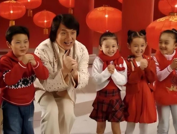 成龙演唱着歌曲,牵着小童星陆子艺,她穿着红色的肚兜和红色的裙子,扎着两个的丸子头,可爱得像精致的年画娃娃。