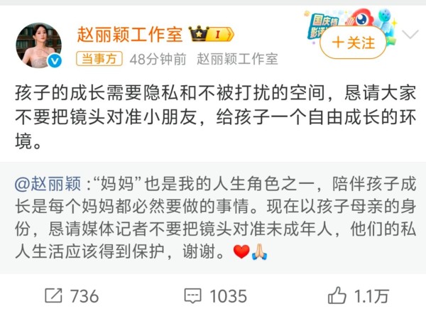 事件的经过始于某媒体将镜头对准了赵丽颖的未成年孩子,可能是在公共场所或私人场合被偷拍,相关照片或视频在网络上流传,引发了粉丝和网友的不满。赵丽颖在社交媒体上发文回应,以孩子母亲的身份恳请媒体记者:“不要把镜头对准未成年人,他们的私人生活应该得到保护,谢谢。” 这段文字配以爱心和祈祷的表情,简洁却充满力量,瞬间点燃了公众的同理心。许多粉丝转发并支持,强调“保护未成年隐私”,并呼吁大家转而关注赵丽颖的作品,而非其家庭生活。