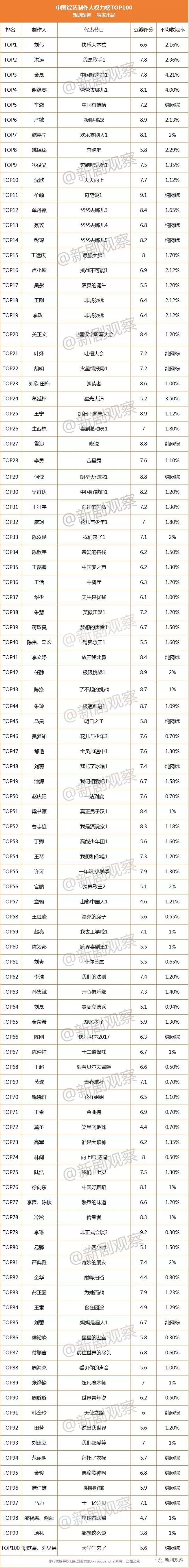 2、 排名综合考量其团队作品播出的商业效果(收视率、网络流量)和口碑(主要参照豆瓣评分),收视率是该综艺某时段的平均收视率;推出过现象级综艺的制作人排名靠前;作品口碑好的制作人排名靠前;