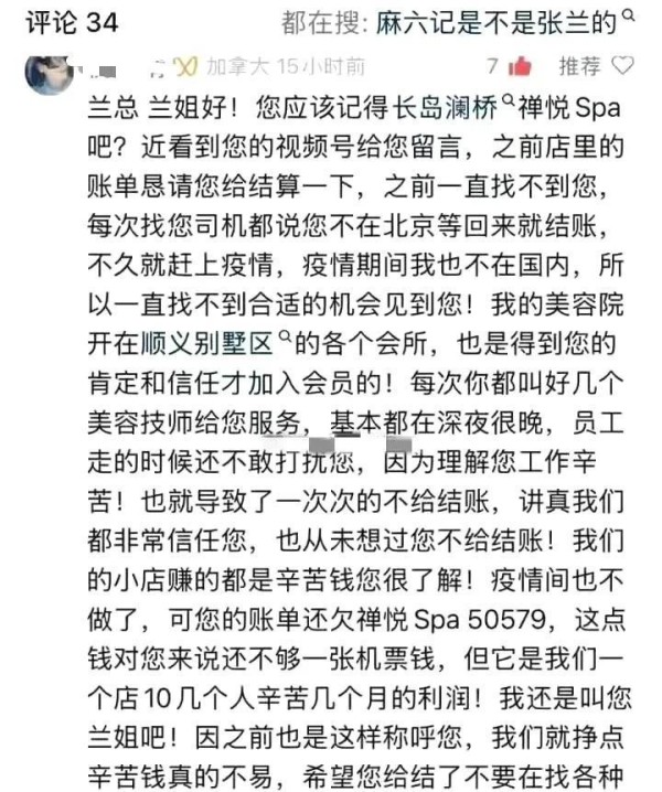 这条留言没有华丽的修饰,字里行间充满了无奈与直白,直接将张兰推向了风口浪尖:兰姐,您应该记得长岛澜桥禅悦Spa吧?