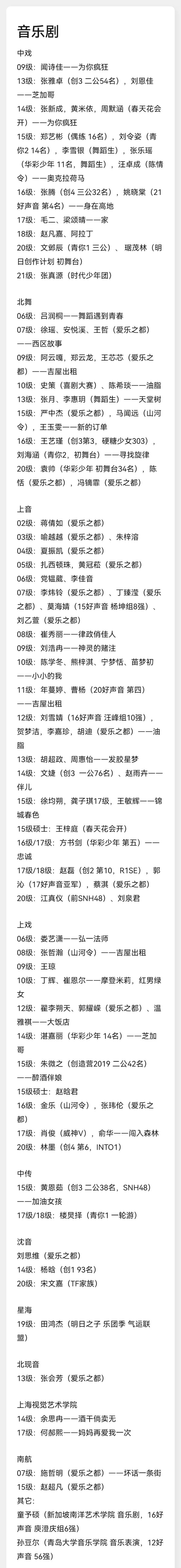 最开始做这个汇总的初衷本来是想看一下各大选秀节目里有多少爱豆或者歌手是音乐剧专业出身的。后来索性将声入人心两季,加上音乐剧女演员以及其他有点知名度的影视演员,歌手等,凡是音乐剧毕业的,在娱乐圈内有点知名度的都加进去了,整理完以后深深体会到了世界的参差。如有错误遗漏望各位大神批评指正
