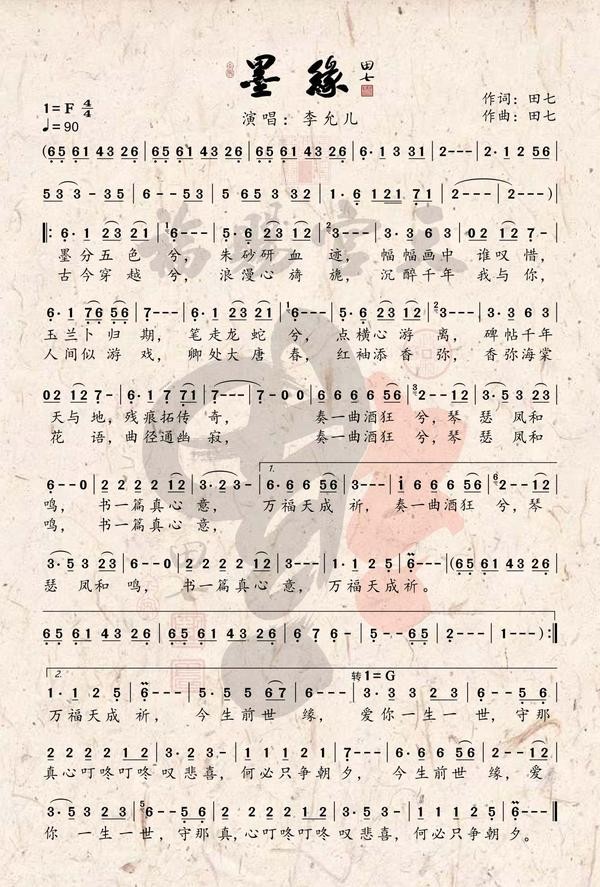 《墨缘》的词曲作者田七是中国当代杰出青年艺术家,创作1000余首歌曲,成立中国原创音乐产业孵化基地,还是歌曲《党建是魂》《爱中国》《铸军魂》《我以茶之名》的词作者,是俄罗斯美协最高荣誉金奖勋章获得者。多年来倡导“东方之美巡展世界,世界之美来自东方”的艺术理念;国画作品《虎子和谐图》《女娲补天图》曾搭载神舟十号飞船遨游太空;艺术作品曾巡展亚洲、欧洲等数十个国家,深受各国人民喜爱。近年来,田七以书法“福”字著称,致力推动中华“福”文化走向世界,是“万福中华”书法创作计划发起人,亲自书写10000张书法福字,于2024年10月1日国庆期间在北京展览馆成功举办“万福中华、齐聚北展、祝福祖国”田七万福书法公益展暨首家“万福书院”揭牌仪式,反响非凡。其书写的“福”字被誉为“中国最美福字”,创作歌曲《万福中华》并撰写《中华万福赋》。这一系列的作品诞生将为推动中华优秀传统文化创造性转化、创新性发展,以时代精神激活中华优秀传统文化的生命力增添活力,值得期待。