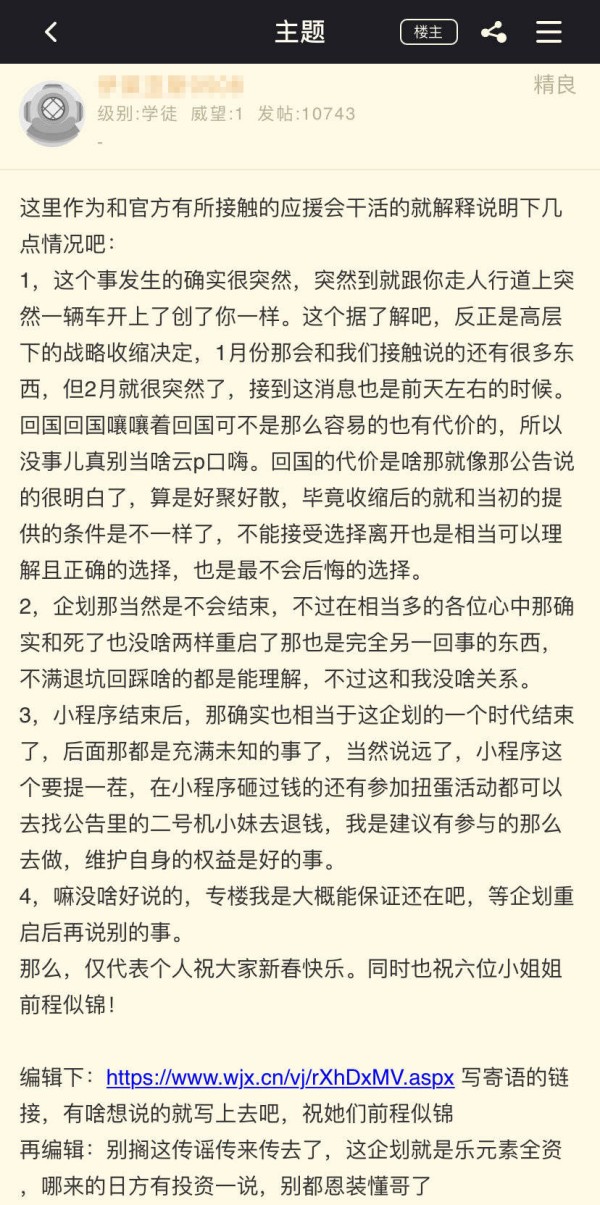 其中看起来比较靠谱的,则是在NGA论坛上有自称与官方有所联系的网友表示,这起事件的发生确实很突然,根本原因还是在于“高层下的战略收缩决定”,在调整完毕后该企划应该会再度重启。