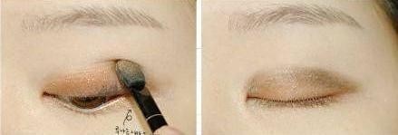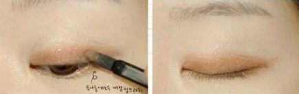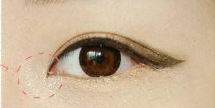 第三步:接著使用浅咖啡色眼影化在眼窝上方(眼摺)