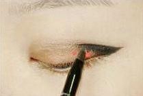 第四步:接著画好眼线并延伸出去,并接著眼影范围顶处勾回去同等长度眼线,然后使用眼影棒晕染