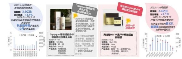 消费者在护肤中对于情绪悦己的心理需求,推动具有香氛功效的身体乳销售增长,通过香气创造沉浸式意境,愉悦身心。秋冬换季时期皮肤干燥,双十一预购配合王俊凯、章若楠等艺人宣传,共同刺激社媒平台关于具有香氛功效的身体乳话题在2023年10月互动量达到高峰。