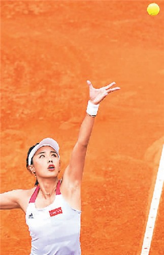 王蔷在比赛中发球。