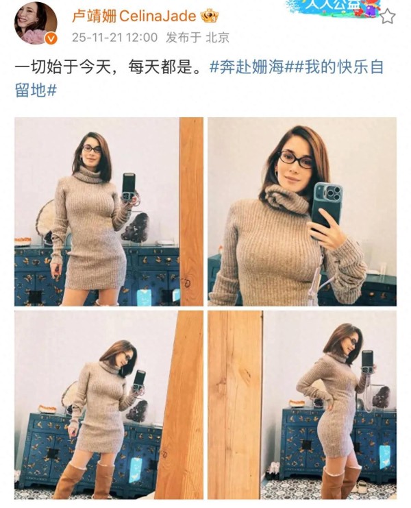 11月21日,卢靖姗在社交平台晒出美照,二胎产后刚出月子的她状态超好,身材恢复如初,S形曲线真的好明显。
