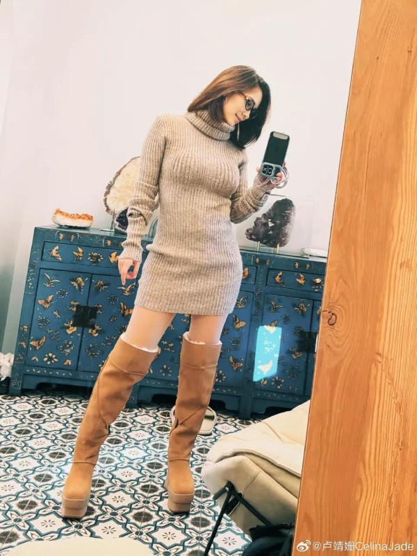 照片中,卢靖姗披着一头及肩发,戴着黑框眼镜,身穿燕麦色高领针织连衣裙,搭配棕色长筒靴,一身修身穿搭时髦显身材。卢靖姗拿着手机在家对镜自拍,完美展示了产后一个月就恢复好的身材状态,网友看了都惊叹不已。