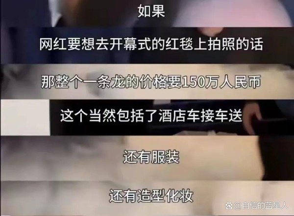此时网上也不是一边倒地欢呼,越来越多的反对声音出来了。有网友说“花150万买红毯名额,和买流量其实差不多。”更有业内人士爆料,红毯秀的“门票”可以一条龙服务,酒店接送、美妆服饰、摄影短视频全包到位,一切“无作品入场”,就是个高级名利场罢了。“拼的不是艺术,是流量和资源。”这种说法虽然扎心,但在业内早就不是什么秘密。