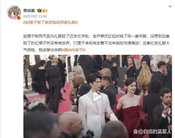 赵樱子戛纳红毯礼服被泼咖啡,紧急求助网友,结果却被请离红毯?