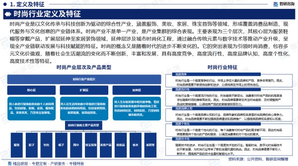 行业定义及特征:时尚产业是以文化传承与科技创新为驱动的综合性产业,涵盖服饰、美妆、家居、珠宝首饰等领域,形成覆盖消费品制造、现代服务与文化创意的产业链体系。它的突出表现为引领时尚消费,包容多元文化价值观,随着社会生活潮流的变化而不断创新、丰富和发展,具有高度竞争、高度流行性、高度品牌认知、高度个性化、高度技术性等特征。