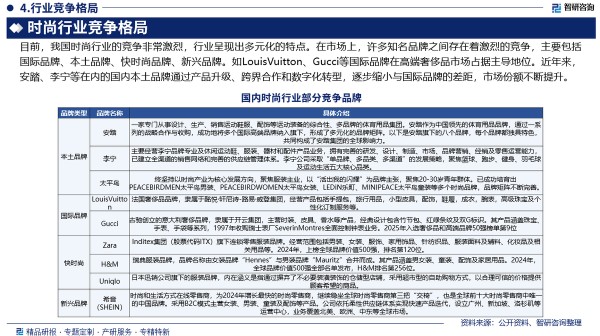 竞争情况:目前,中国时尚行业的竞争非常激烈,行业呈现出多元化的特点。在市场上,许多知名品牌之间存在着激烈的竞争,主要包括国际品牌、本土品牌、快时尚品牌、新兴品牌。如Louis Vuitton、Gucci等国际品牌在高端奢侈品市场占据主导地位。近年来,安踏、李宁等在内的国内本土品牌通过产品升级、跨界合作和数字化转型,逐步缩小与国际品牌的差距,市场份额不断提升。