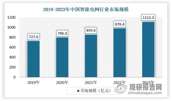 随着宏观政策、数字技术进步与升级等多重利好因素的叠加影响,能源与互联网融合进程加快,智能电网行业迎来高速发展阶段。发电量庞大伴随数字技术进步与升级,能源与互联网融合进程加快,智能电网进入黄金发展期,市场规模快速扩张。2018-2023年我国智能电网市场规模由727.6亿元增长至1112.3亿元,复合增长率为11.19%。