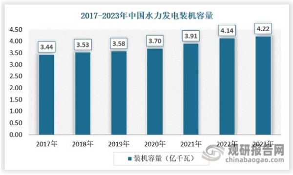 由于我国社会用电需求攀升,国家鼓励因地制宜发展水电,水电装机容量不断增加。根据国家统计局数据,我国水力发电装机容量由2017年的3.44亿千瓦增长至2022年的4.14亿千瓦,复合年均增长率达3.8%。2023年我国水力发电装机容量增至4.22亿千瓦。