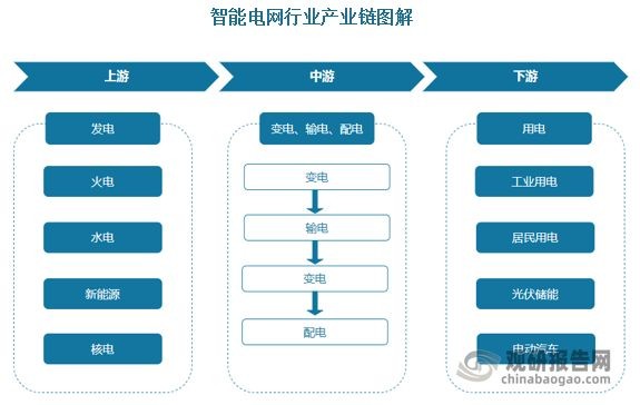 智能电网产业链共涉及发电、变电、输电、配电以及用电五个大环节。其中,发电环节包括可再生能源发电(水力发电等)与不可再生能源发电(火力发电等);而中游则为智能电网的各个环节,主要有智能变电、智能输电和智能配电;下游则是电能的终端用户用电环节,主要分为工业用电、居民用电以及各种类型的商业用电。