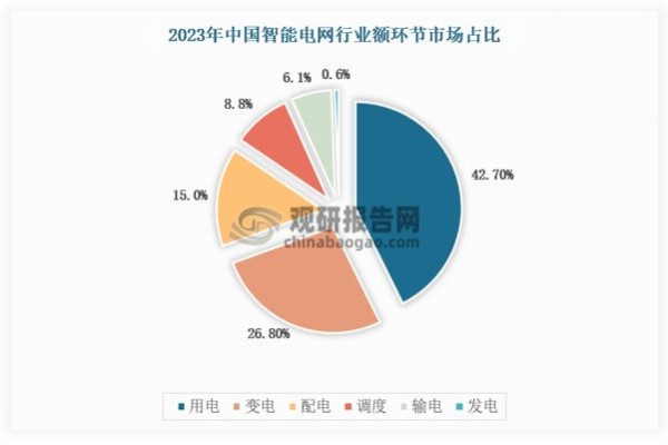 随着电网智能化进程不断向电力需求侧推进,用电、变电、配电环节将成为智能电网未来发展的重点,其市场占比分别为42.7%、26.8%、15%,预计未来市场占比将持续增加。电力供给侧在智能化先期建设初步完成的背景下,市场空间被逐渐压缩,发展速度趋缓。