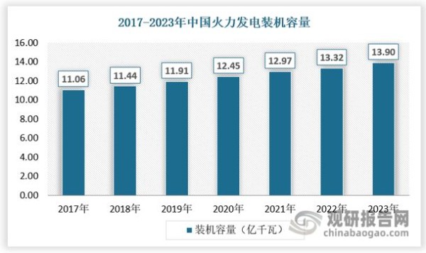 相较其他能源发电,我国火力发电技术起步较早,火电占领电力的大部分市场,行业发展处于成熟阶段。近年来,火力发电量保持稳定增长,受环保、电源结构改革等政策影响,火力发电量市场占有比重呈逐年小幅下降态势,但同时受能源结构、历史电力装机布局等因素影响,国内电源结构仍将长期以火电为主。从火电装机容量来看,2022年我国火电装机容量13.32亿千瓦,同比增长2.7%。根据国家统计局数据,2023年我国火电装机规模将增至13.90亿千瓦。