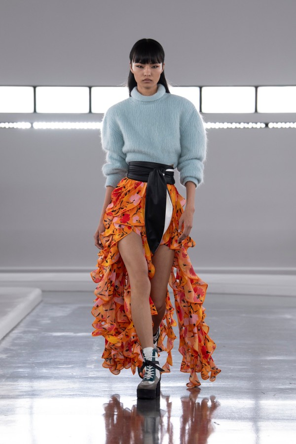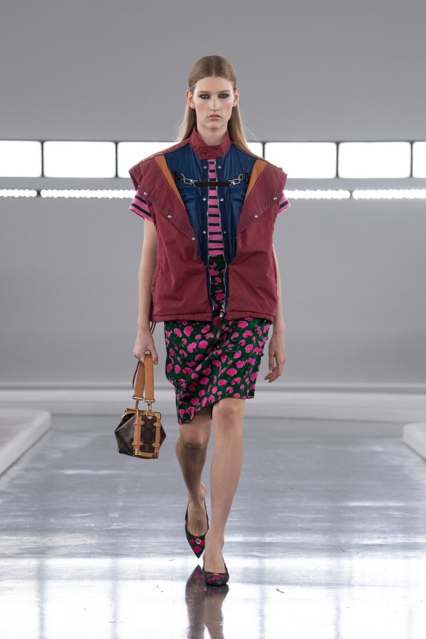 Nicolas Ghesquière毫不掩饰对不规则层叠设计的钟爱,这种叠加延伸至奇幻印花、对比鲜明的结构比例。于是,繁复的剪裁线条开始变得流畅,神圣的事物也随之轻快起来,反之,熟悉的元素则被赋予高雅的气质。人们为其作品的丰富色彩、褶裥细节和浪漫主义风格而惊叹。对此,Marina Foïs给出了她的答案:“我们不能忘记色彩大师Nicolas。人们对其作品的这一方面知之甚少。他满怀对色彩的热爱,有着运用色彩的极高天赋,其色彩的搭配有着孩童般的任性。大片的蓝、大片的黄、亮眼的橙,还有绿色……但这奏效了,因为这样的搭配是如此真诚、触动人心。”造就了一个无忧无虑、轻松愉悦的系列