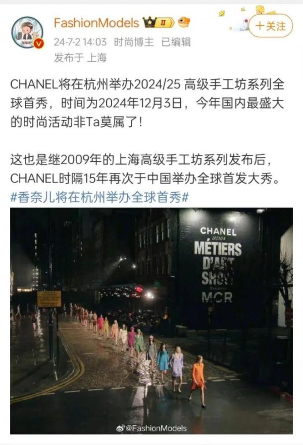 爆料的是一名ID为FashionModels的博主,他在微博内容里声称:“CHANEL将在杭州举办2024/25高级手工坊系列全球首秀,时间为2024年12月3日,今年国内最盛大的时尚活动非Ta莫属了!”