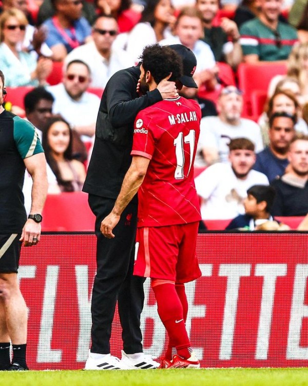 第23分钟,意外突然发生,萨拉赫感到不适,8分钟之后他无法坚持,在利物浦球迷的掌声当中退场,克洛普也送上安慰性的拥抱。