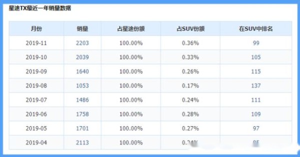 奇瑞高端品牌“星途EXEED”旗下第一款SUV——星途TX,自上市以来一直不温不火,11月份只卖出了2203台,上市至今累计销量也仅13993台,与吉利领克、长城WEY还是有一定的差距。