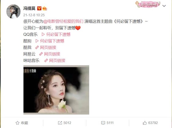 值得一提的是,冯提莫这首新歌是即将上映的一部电影的主题曲,这部电影是《曾经相爱的我们》,将在12月10日上映,由郭采洁、陈柏霖主演。