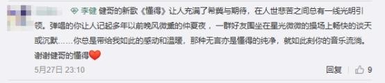 另一位网友则表示 “健哥的新歌《懂得》让人充满了希冀与期待,在人世悲苦之间总有一线光明引领。弹唱的你让人记起多年以前晚风微熏的仲夏夜 ,一群好友围坐在星光微微的操场上畅快的谈天或沉默……你总是带给我如此的感动和温暖,那种无言亦是懂得的纯净,就如此刻你的音乐流淌。谢谢健哥的懂得”。还有以为“土豪”粉丝“你觉得辣条好吃吗”在下面为偶像打抱不平:“有人说李健唱歌不好听,我二话没说直接掏钱给他买了只导盲犬”。像这样微博下遍地都是真爱粉的音乐人,真的相当难得。