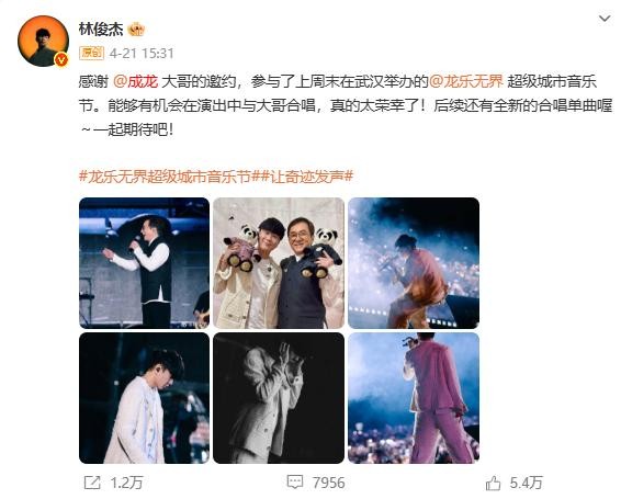 4月21日下午,歌手林俊杰更新个人社交媒体账号发文:感谢成龙大哥的邀约,参与了上周末在武汉举办的超级城市音乐节。