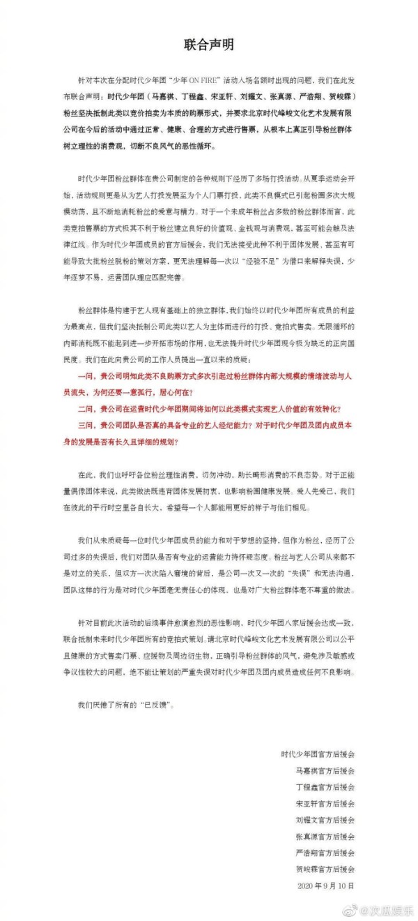 5 / 9 时代少年团粉丝八家后援会出了联合声明!要求公司通过正常、健康、合理的方式进行售票,从根本上真正引导粉丝群体树立理性的消费观。这是在回应李飞搞的打歌舞台氪金竞拍吧?看来这回李飞是摊上了!