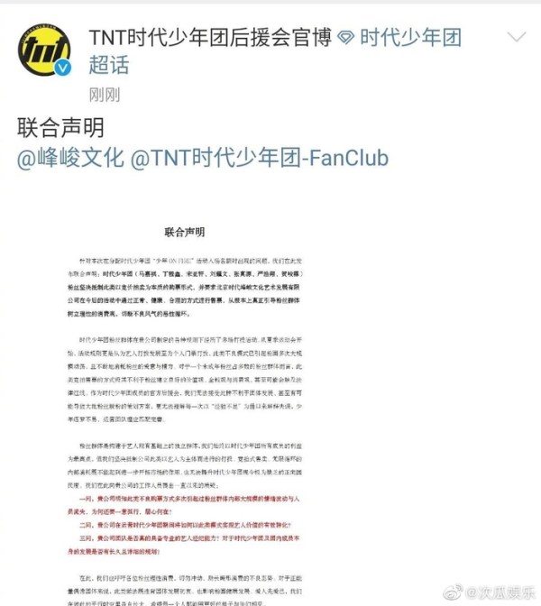 8 / 9 时代少年团粉丝八家后援会出了联合声明!要求公司通过正常、健康、合理的方式进行售票,从根本上真正引导粉丝群体树立理性的消费观。这是在回应李飞搞的打歌舞台氪金竞拍吧?看来这回李飞是摊上了!