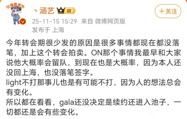 今天BLG有个粉丝见面会,来的只有BLG三大菜Bin、Beichuan、Elk!这仨人和BLG还有一年合同,blc绝望不绝望?而且shad0w、Knight、ON没来参加就是离队了,去年年底最后一个活动Xun也没参加! JDG接触Creme透露出两个信息,一个是TES不是非得要Creme,另一个是Knight要回TES!369没走,这就是Knight回TES的一大动力。Knight和Creme都进池子,并且都Ban掉BLG,这样TES和JDG可以任选其一。TES也有考虑Xun,明年TES的中野会是Xun和Knight! ON并没有续约,闹麻了!ON都已经不想跟这