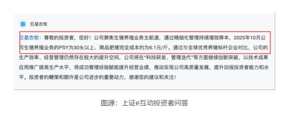 与此同时,记者注意到巨星农牧10月份的PSY已达30头以上,商品肥猪完全成本降至6.1元/斤,较去年同期大幅下降近13%,且已大幅领先公司去年规划的“2025年商品肥猪完全成本6.5元/斤”的目标,公司提质增效成果显著,展现出强劲发展势头。