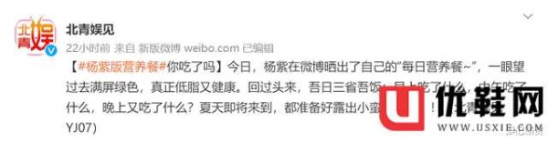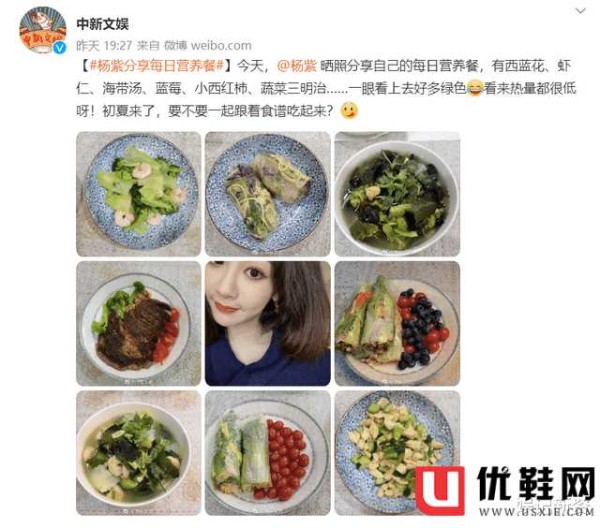 而她的营养餐也是受到了媒体北京青年报文娱官方微博的点名,称:一眼望过去满屏绿色,真正低脂又健康。而中国新闻网文娱官方微博也转发了杨紫的营养餐,表示一眼看上去好多绿色。看来热量都很低呀!初夏来了,要不要一起跟着食谱吃起来?
