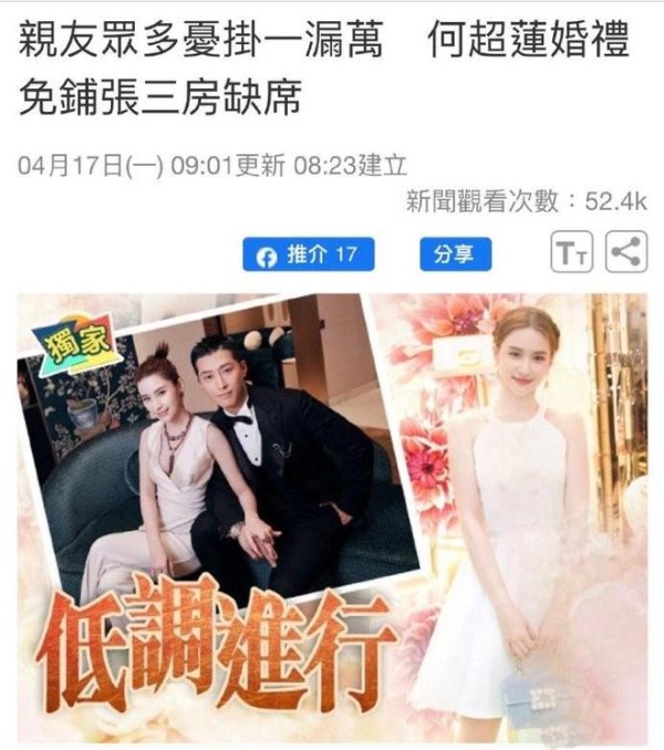 在婚礼举办之前,港媒报道何超莲的家人(妈妈陈婉珍、姐姐何超云、弟弟何猷启)会缺席婚礼,原因是为避免双方亲友劳累,这场婚礼只邀请好友,之后再返港宴请亲友。但实际情况是:陈婉珍、何超云、何猷启全部参加了婚礼,因为何鸿燊去世了,所以何超莲的舅舅代替何鸿燊,行使了“爸爸”的权利。
