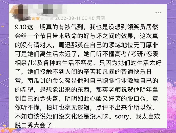 但这场铺天盖地的负面舆论,无疑给综艺行业的嘉宾选择,以及艺人的形象塑造和呈现方式敲响了警钟。更深层次地看,是观众对明星的期待在发生变化。特别是在《脱口秀大会》这样一档与生活紧密相连,且选拔机制仍保持草根特色的“极致”综艺舞台上,非专业因素的介入更容易激起观众与舞台产生的共鸣,从而引发他们的愤怒。甚至在面对接连不断的负面信息时,“不食人间烟火”这一标签不再显得那么正面和中立,明星的某些“原罪”也被前所未有地放大。
