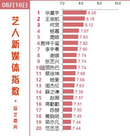 目前热度排名前五的综艺嘉宾依次是花花华晨宇、TFBOYS王俊凯、何炅、杨幂、鹿晗,排在第6~第10位的综艺嘉宾依次是易烊千玺、李宇春、谢娜、张艺兴、迪丽热巴,其中华晨宇夺冠,王俊凯力压何炅居次席,热度飙升的易烊千玺排第六。