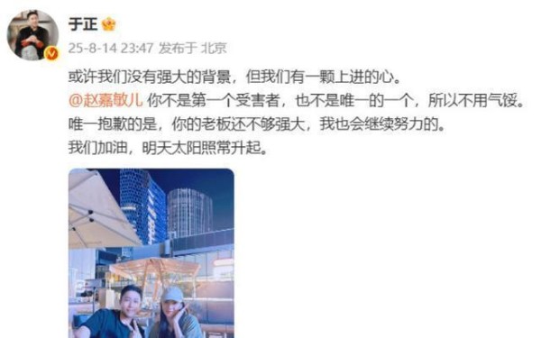 更有意思的是,于正亲自下场发文,说什么“我们没有强大的背景,但我们有一颗上进的心”,又道歉说“你的老板不够强大,我会继续努力”。这一套操作下来,不少网友立马脑补出一部职场宫斗剧:小艺人辛苦打拼,无奈被资本碾压;经纪人大义凛然,却也无能为力。要不是知道这是现实生活,还真以为哪家编剧又写新戏本子呢!